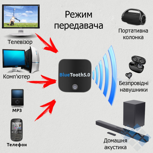 Це універсальний Bluetooth аудіо адаптер 2 в 1 (Transmitter + Receiver – Передавач + Приймач) працює як на передачу, так і на прийом аудіосигналу.