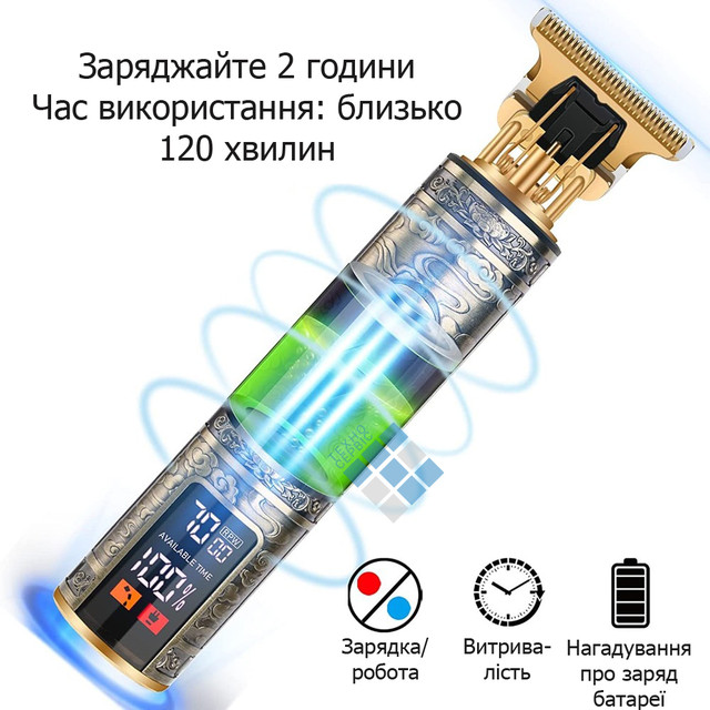 Стильний вінтажний дизайн і металевий корпус з вишуканим різьбленням роблять цей тример воістину унікальним. Його невеликий розмір ідеальний для подорожей. Машинка має РК-дисплей на якому відображається рівень заряду. Підійде будь-якому користувачеві. Її неймовірно потужний двигун дає змогу швидко стригти волосся і бороди, а прецизійні леза можна використовувати для створення приголомшливих візерунків за секунди!