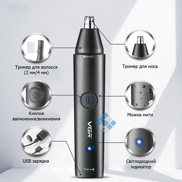 Тример VGR - це прилад для видалення волосся з носа, вух і гоління бакенбард за допомогою одного інструменту. Він дає змогу робити стрижку волосся в носі, вухах, на скронях, бакенбардах, бороді та для стрижки волосся на тілі, інтимної стрижки. Сучасний дизайн, а також великим плюсом є додаткова насадка для гоління обличчя і тіла. Ножі виготовлені з нержавіючої сталі, які легко миються під струменем води.