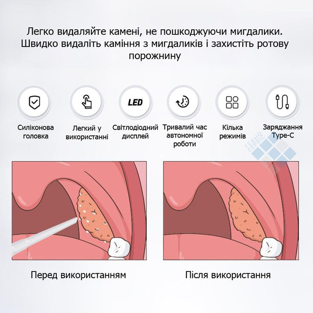Ви коли-небудь стикалися з неприємним запахом з рота або відчуттям дискомфорту в горлі, причиною яких можуть бути мигдалинові пробки? Тепер цю проблему можна вирішити швидко, безпечно й ефективно! Представляємо електричний вакуумний очищувач мигдалин - інноваційний пристрій для ретельного догляду за порожниною рота.