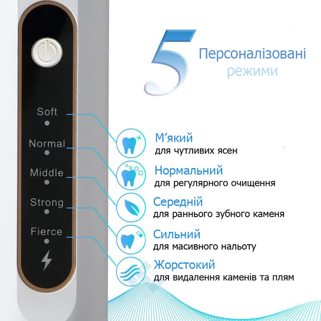 - Технологія ультразвукового очищення: в наших зубних пристроях для видалення зубного нальоту використовується високочастотна вібрація (з тактовою частотою 40 кГц), що на 50% вище, ніж у звичайних миючих засобах для зубів.