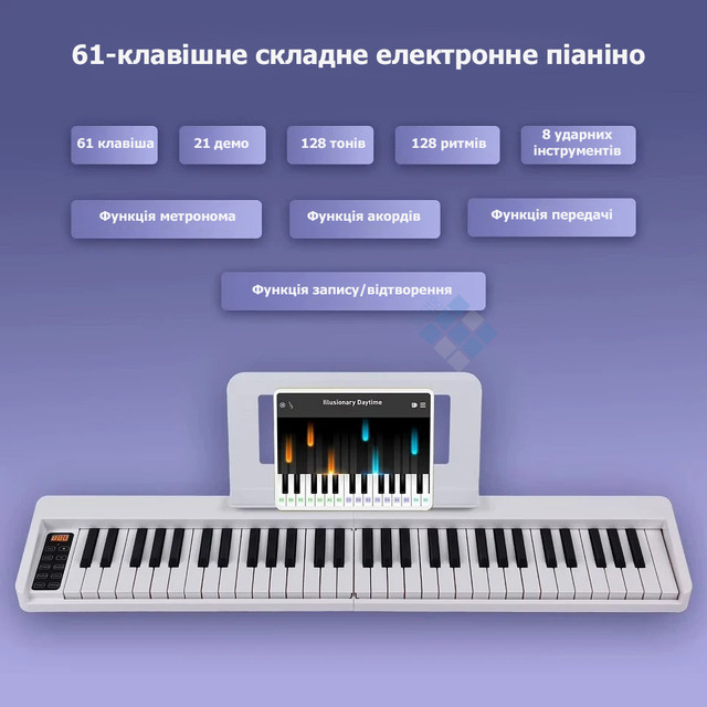 - Півважка клавіатура на 61 клавішу – забезпечує зручність гри та максимально наближене до справжнього фортепіано відчуття.