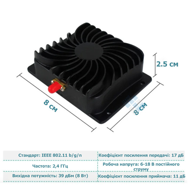 - Вихідна потужність: 8000 мВт / 39 dBm.